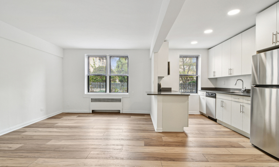 Renovated 2 bedroom, 1 bathroom apartment. This apartment features a renovated kitchen with white ceasarstone countertops, custom cabinetry, and stainless steel appliances.