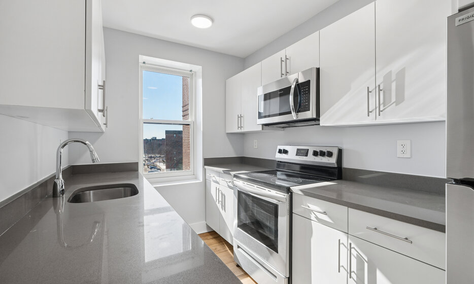 Renovated 2 bedroom, 1 bathroom apartment. This apartment features a renovated kitchen with white caesarstone countertops, custom cabinetry, and stainless steel appliances.