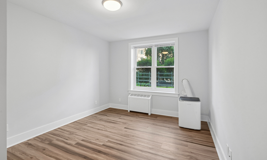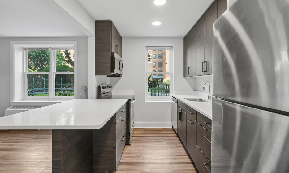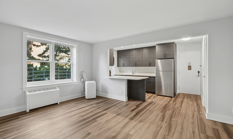 Renovated 2 bedroom, 1 bathroom apartment. This apartment features a renovated kitchen with white caesarstone countertops, custom cabinetry, and stainless steel appliances.