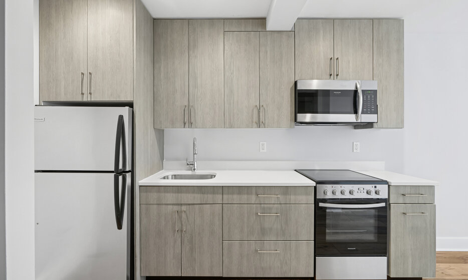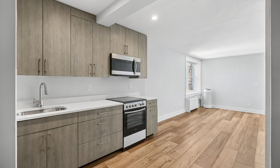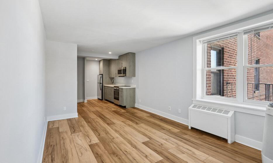 Spacious renovated studio apartment located in Far Rockaway. This apartment features a renovated kitchen with white caesarstone countertops, custom cabinetry, and stainless-steel appliances.