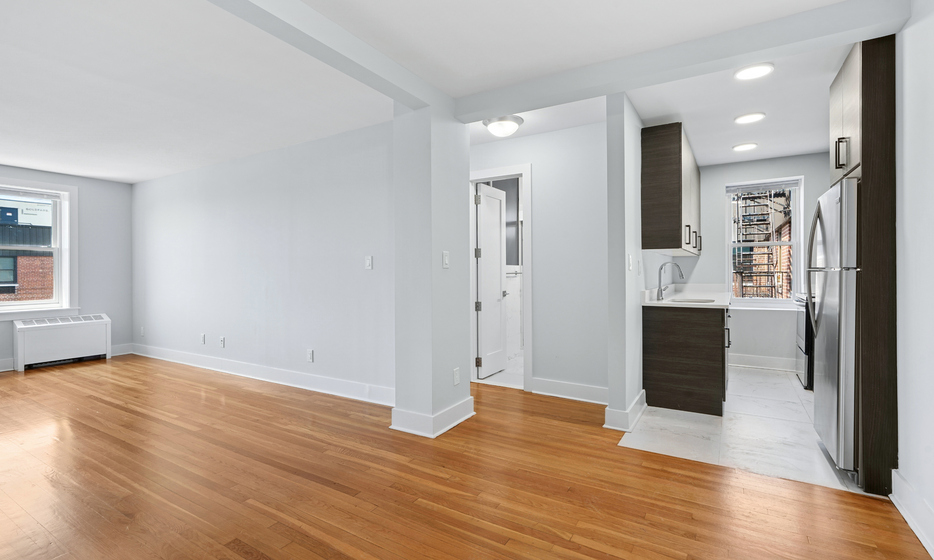 Renovated 1 bedroom, 1 bathroom apartment. This apartment features a renovated kitchen with white caesarstone countertops, custom cabinetry, and stainless steel appliances.