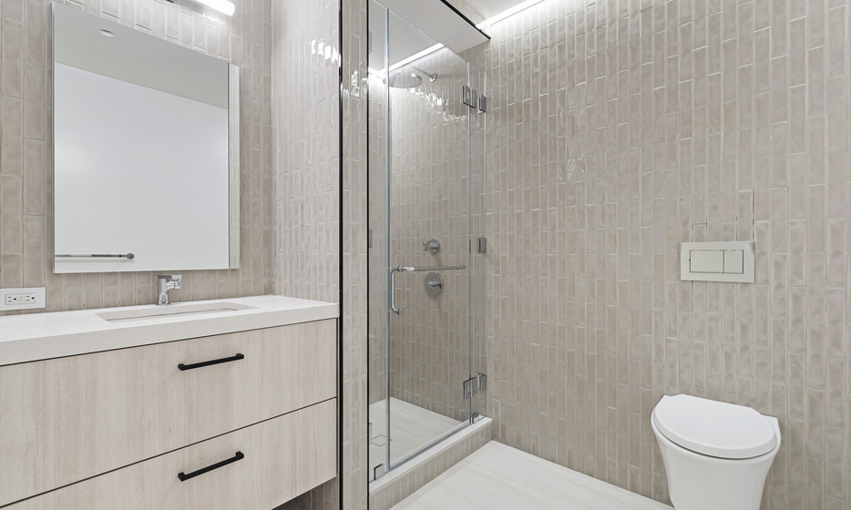 Spanning over 1,600 square feet, the home is finished with whitewashed oak flooring throughout. The primary suite includes a large walk-in wardrobe, and each bedroom provides ample storage. Two of the bedrooms include en-suite baths, all newly renovated with Kallista fixtures and walnut vanities. A separate laundry room with in-unit washer and dryer offers added convenience.