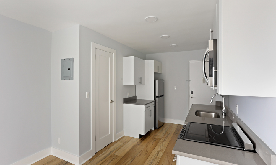 Renovated studio, 1 bathroom apartment. This apartment features a renovated kitchen with white caesarstone countertops, custom cabinetry, and stainless steel appliances.