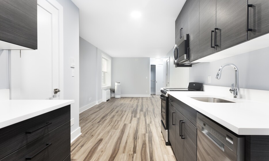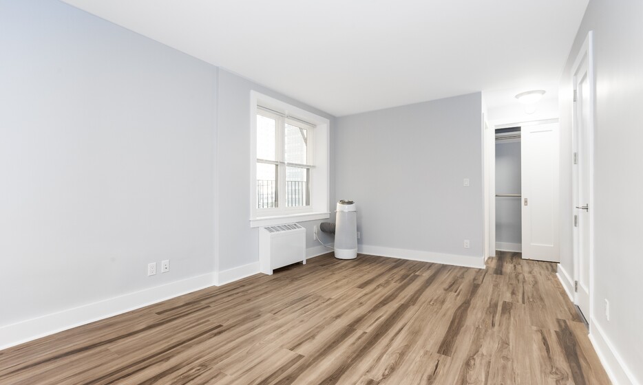 Renovated spacious studio, 1 bathroom apartment. This apartment features a renovated kitchen with white caesarstone countertops, custom cabinetry, and stainless-steel appliances.