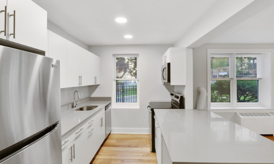 Renovated 2 bedroom, 1 bathroom apartment. This apartment features a renovated kitchen with white caesarstone countertops, custom cabinetry, and stainless steel appliances.